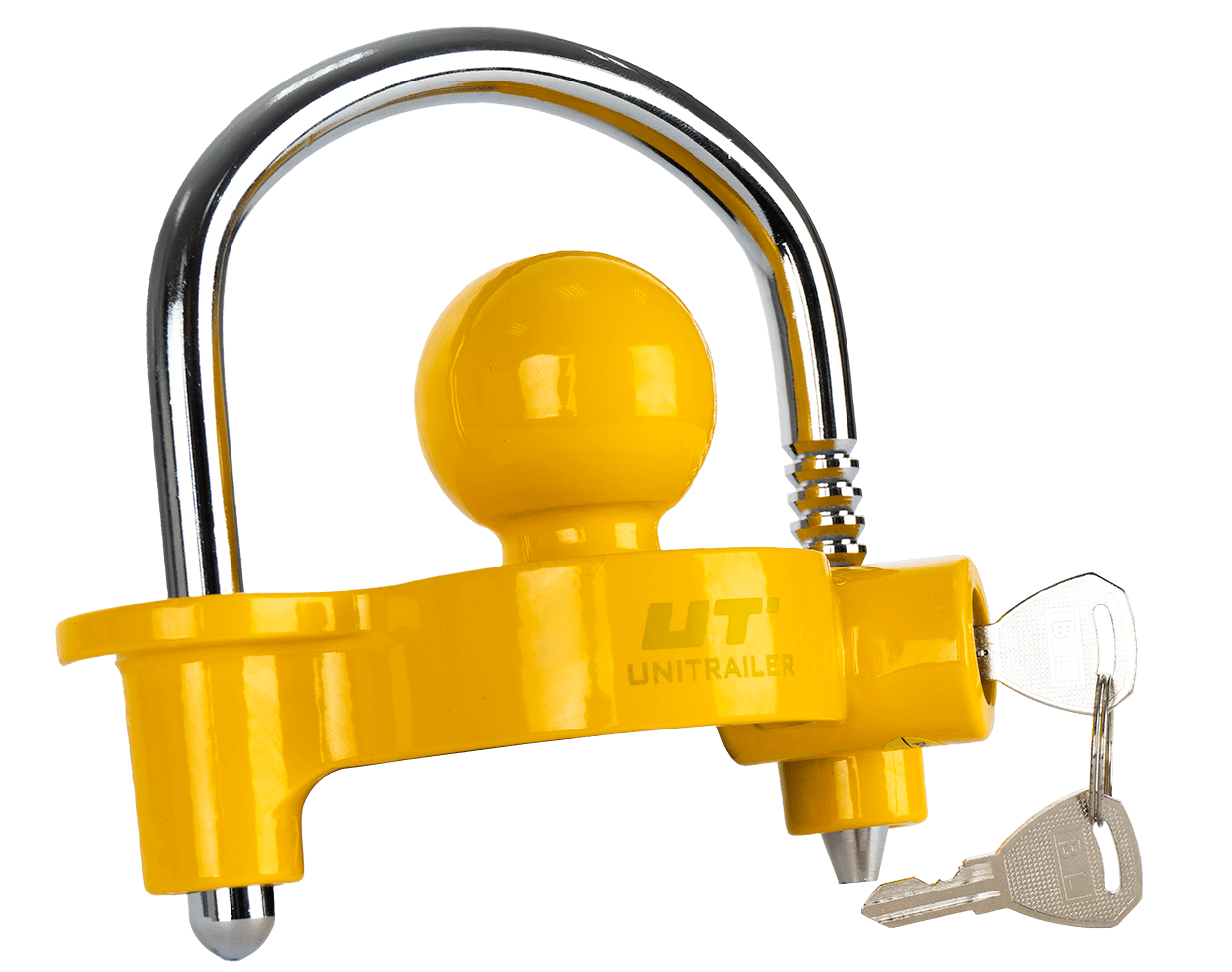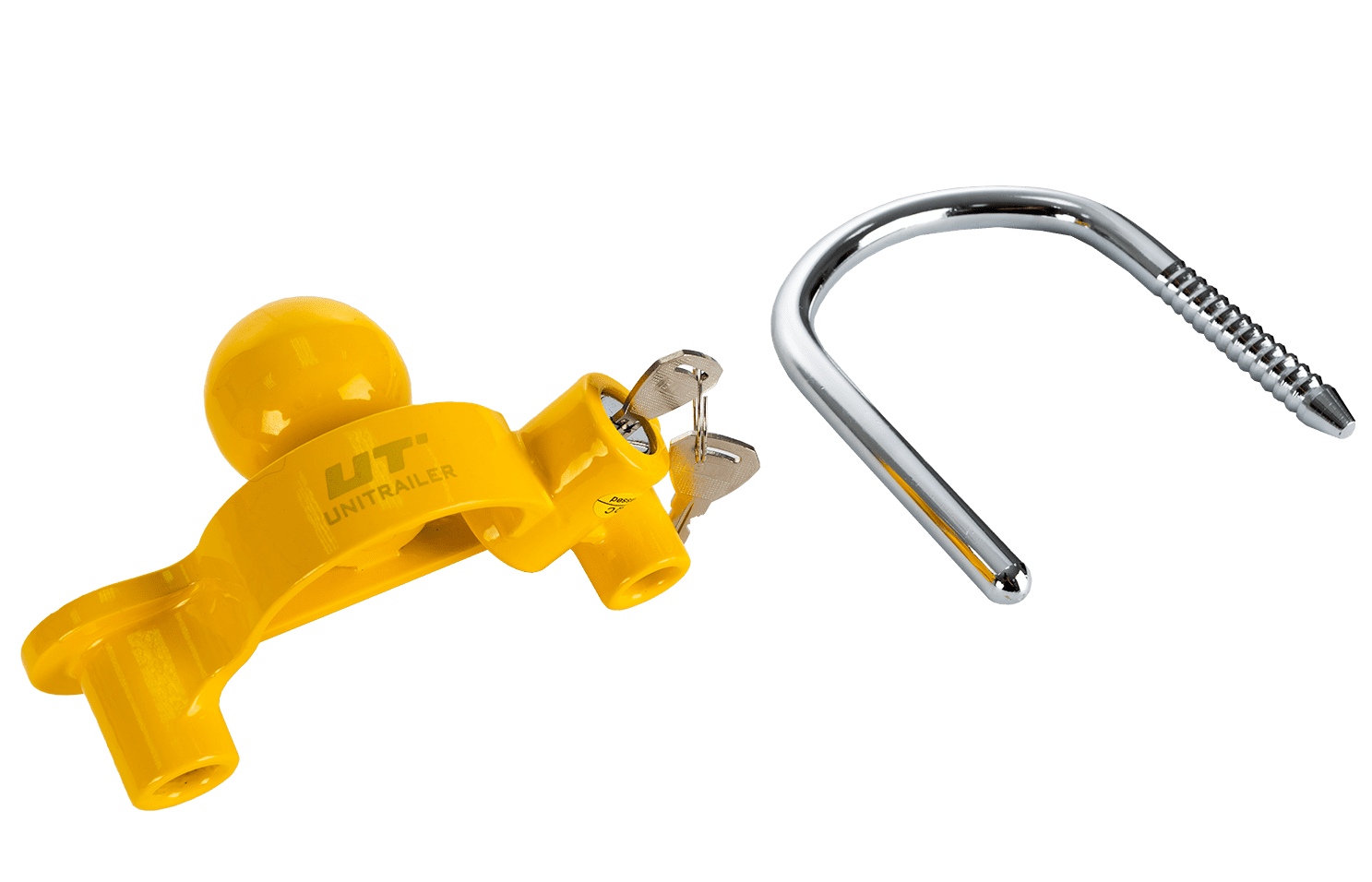 Univerzální zámek tažného zařízení od Unitrailer, který účinně chrání zaparkovaný přívěs proti krádeži.